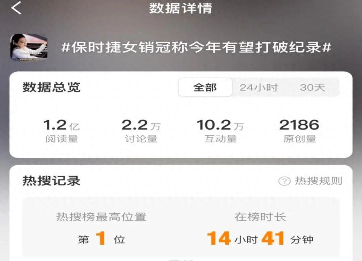 之后,“保时捷女销冠上半年卖出近100台”“可能打破前两年纪录”等相关话题登顶热搜。